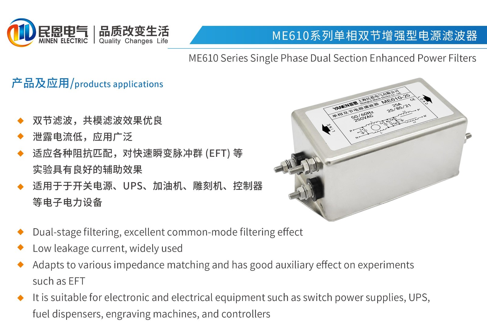 ME610系列單相雙節(jié)增強型電源濾波器
